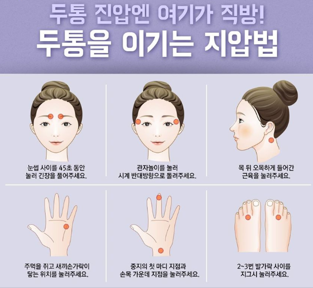 위 지압 포인트를 마사지해주면 편두통 완화에 효과가 있습니다.