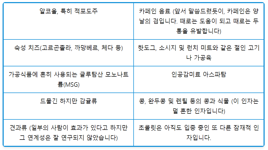 ※ 참고 : 편두통을 유발할 수 있는 음식들