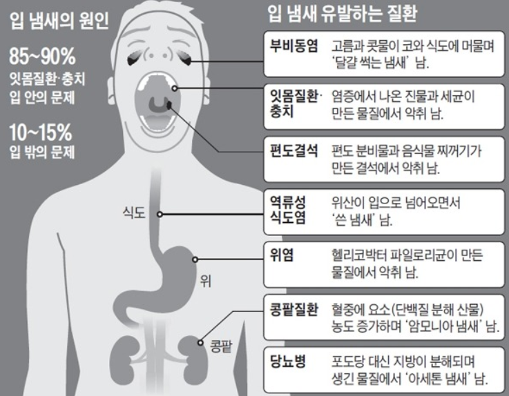 또한, 부비동염으로 인해 고름과 콧물이 코와 식도에 머물며 '달걀 썩는 냄새'가 나기도 하며, 잇몸 질환 및 충치로 인해 염증에서 나온 진물과 세균이 만들 물질에서 악취가 나기도 합니다.